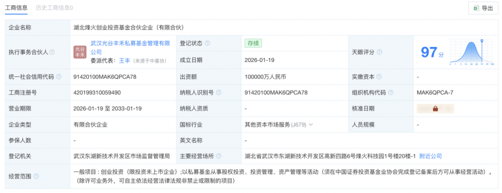 该基金认缴出资额为10亿人民币,执行事务合伙人为武汉光谷丰禾私募基金管理有限公司。