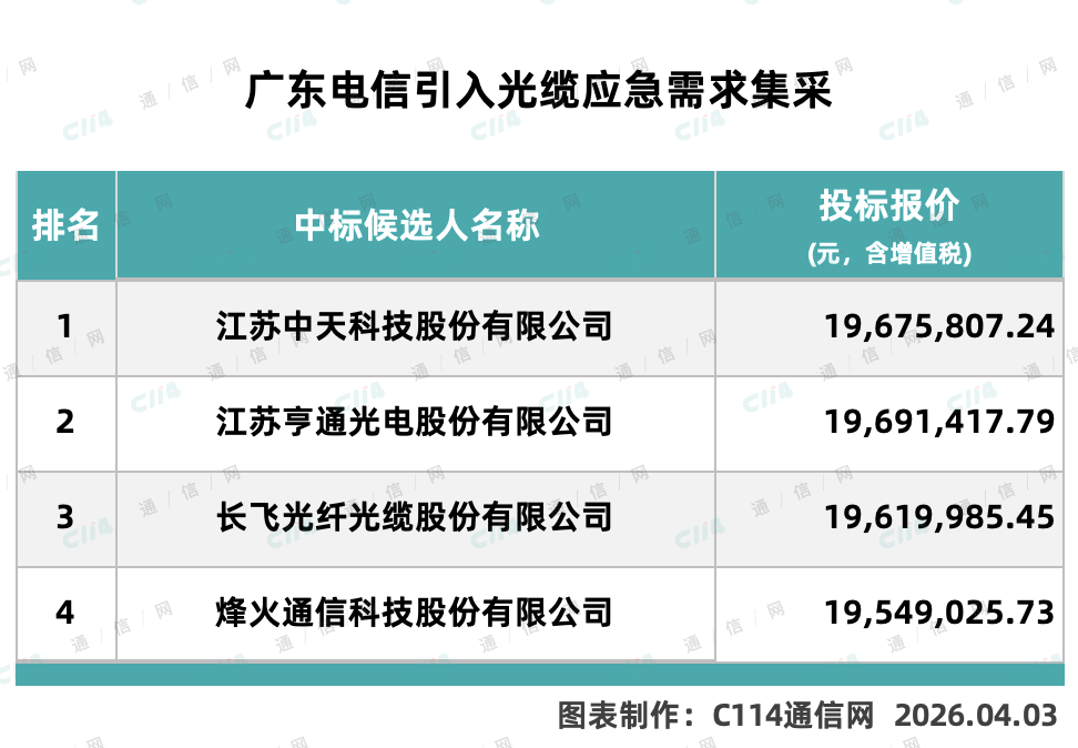 C114讯 4月3日消息(水易)来自中国电信阳光采购网消息,广东电信2026引入光缆应急需求框架采购项目终于落地。中天科技、亨通光电、长飞光纤、烽火通信入围。
