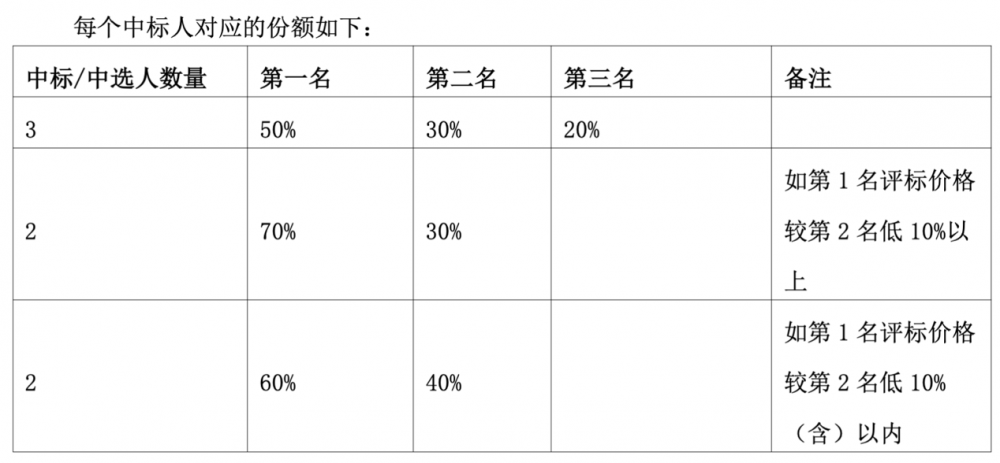 与此同时,根据招标规则,当中标候选人数量为4个时,中标人数量为3个,中标份额分别为50%、30%、20%。