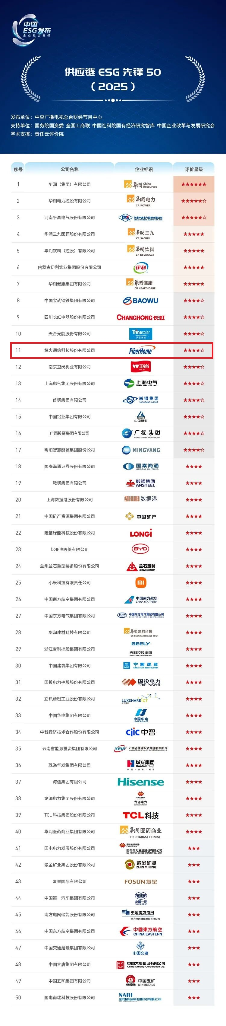 10月24日,在ESG中国·创新年会(2025)暨首届ESG国际博览会上,中央广播电视总台《供应链ESG行动报告(2025)》正式发布,烽火通信凭借在供应链ESG领域的优秀实践成果荣登“供应链ESG先锋50(2025)”榜单。