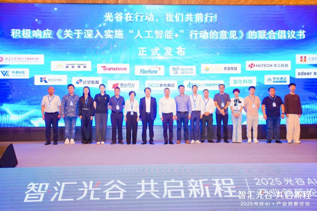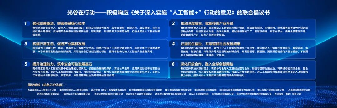 在论坛上,为积极响应国务院《关于深入实施“人工智能+”行动的意见》,东湖高新区人工智能+办公室组织光谷的十七家企业和科研院所发布了“光谷在行动”联合倡议。该倡议的发布,既是光谷响应国家 “人工智能+”战略的坚定表态,更彰显了光谷AI产业集群引领行业发展、助力数字中国建设的责任与担当。
