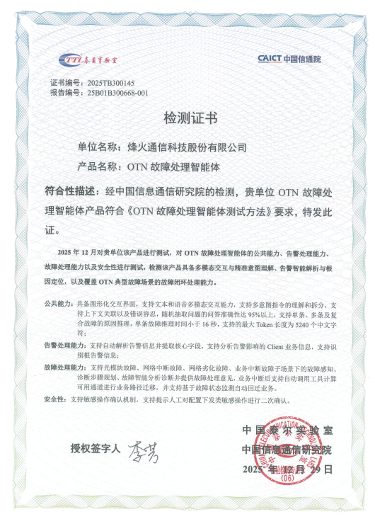 近日,烽火通信OTN故障处理智能体率先通过中国信息通信研究院泰尔实验室专业测试认证,这是国内传送网领域故障智能体技术首个专业化权威认证。同期,辽宁移动携手烽火通信成功完成故障智能体现 网工程试点,标志着烽火通信故障智能技术已具备专业化、标准化应用能力,管控系统智能化运维正式迈入L4级别。